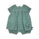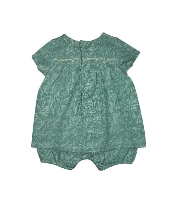 Combirobe bandeau en maille tout en un Nine Sucre d'Orge . Robe verte imprimée vert clair - empiècements haut devant et dos se terminant par un volant, ouverture dos pressionnée. En dessous, rattaché à la robe au niveau de l'empiècement poitrine, un bas bloomer qui s'ouvre par bouton-pression à l'entrejambe. un bandeau coordonné finalise la tenue. La petite combirobe est pratique et girly. Composition: combirobe et bandeau 100% coton. Existe du 1 au 12 mois.