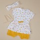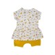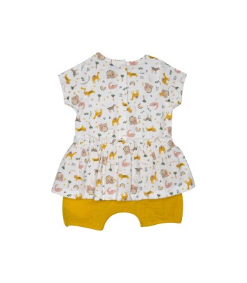 Combirobe bandeau Lou Sucre d'Orge manches courtes. Robe en jersey blanc imprimée d'animaux sauvages, agrémentée d'une ceinture volantée avec un nœud fantaisie. Bloomer en gaze jaune rattaché à la robe par la ceinture. Elle s'ouvre par boutons-pression dans le dos et à l'entrejambe pour plus de praticité. Un bandeau dans le même imprimé complète la tenue. Composition: Robe imprimée 100% coton, bas jaune 100% coton bandeau 100% coton. Existe du 1 au 12 mois.