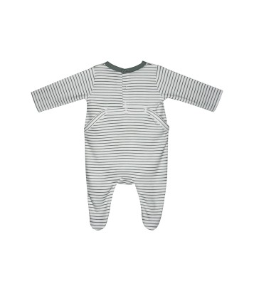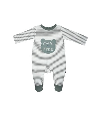 Pyjama Sucre d'orge modèle Nahim blanc rayé vert, dessus des pieds et l'encolure réhaussé de vert - Illustration d'une tête et d'un texte "j'peux pas j'ai bêtises". Ouverture pont dos pressionnée. Composition : Interlock 100% coton. Taille du 3 au 24 mois.