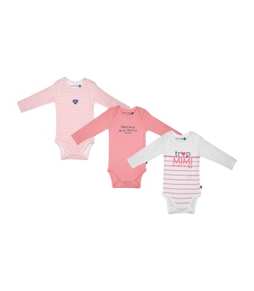 LOT DE 3 BODIES JANELLE MANCHES LONGUES BEBE "Lot de 3 bodies Janelle Sucre d'orge Détails produit : 1 body blanc devant imprimé rose. 1 body rayé blanc/rose avec motif poitrine. 1 body rose uni avec message ""Petit bout de la famille"". Manches longues - encolure américaine - ouverture entrejambe par boutons pression. Composition : 100% coton Oeko Tex. Taille : Du 3 au 24 mois."