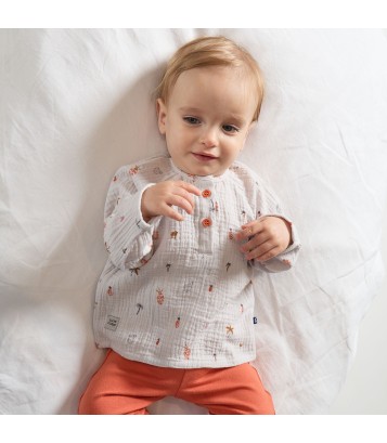 CHEMISE PANTALON NINO MANCHES LONGUES NAISSANCE Ensemble chemise pantalon Sucre d'orge modèle Nino. Détails produit : Chemise beige imprimé caramel et orange - ouverture devant par boutons. Pantalon orange, deux fausses poches, lien et taille élastiquée. Composition : Chemise 100% coton - Pantalon 96% coton, 4% élasthanne. Tailles : Du 1 mois au 18 mois