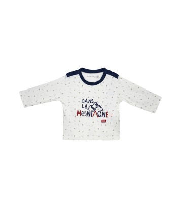 Ensemble bébé garçon Sucre d'Orge modèle Jaouad. T-shirt écru avec impression beige manches longues, ouverturess épaules pressionnées - broderie sur le devant "DANS LA MONTAGNE". Pantalon molleton rouge, monté sur une ceinture plate élastique avec un lien marine, revers bas jambes. Composition : T-shirt interlock 100% coton, pantalon molleton 96% coton 4% élasthane. Existe du 3 mois au 24 mois.