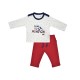 TSHIRT PANTALON JAOUAD MAILLE BEBE "Ensemble T-shirt et pantalon modèle Jaouad Sucre d'Orge Détails produit : T-shirt manches longues imprimé beige sur fond écru, encolure ronde, ouvertures épaules pressionnées, broderie devant. Pantalon molleton rouge, ceinture plate élastique, liens marine. Composition : T-shirt interlock 100% coton Pantalon molleton 96% coton 4% élasthane. Tailles : Du 3 mois au 24 mois."
