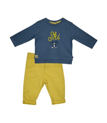 Ensemble bébé garçon Sucre d'Orge modèle Michel. T-shirt bleu à manches longues, ouverture dos pressionnée - illustration sur le devant "Ski" avec un pingouin. Pantalon jaune avec deux poches. Un ensemble tout confort pour bébé ! Composition : T-shirt 100% coton, pantalon dessus 96% coton 4% élasthanne - dessous 100% coton. Existe du 3 mois au 24 mois.