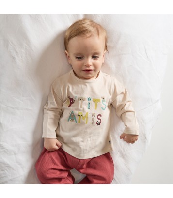 Ensemble T-shirt et pantalon Nils Sucre d'Orge . Un tee shirt en jersey beige avec une illustration animaux en forme de lettre "P'tits amis", qui apporte une touche de couleur, encolure ronde avec des manches longues - Ouverture dos par boutons-pression. Un pantalon en nid d'abeille léger bordeaux - taille élastique avec un petit bouton de décoration. Des chaussettes assorties pour compléter la tenue. Un ensemble tout confort pour bébé. Composition : Tee shirt 100% coton Pantalon 100% coton Chaussettes 80% coton 17% polyamide 3% élasthanne. Existe de la taille 1 mois au 18 mois.