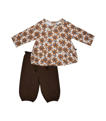 Ensemble Tunique jegging bébé fille Sucre d'Orge modèle Martine.Tunique imprimée de fleurs caramel sur fond beige, manches longues, col rond. Ouverture dos pressionnée pour un habillage facile. Jegging marron avec bas des chevilles élastique, taille élastiquée avec un petit lien milieu devant pour resserrer. Un ensemble tout confort pour bébé ! Composition : Tunique 100% coton - Pantalon 96% coton 4% élasthanne. Existe du 3 mois au 24 mois.