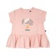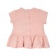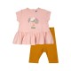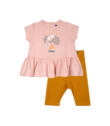 Ensemble bébé fille Nadiona Sucre d'orge. Tunique jersey rose encolure ronde, manches courtes, volant froncé à la base, ouverture dos pressionnée, avec une illustration de fleurs et de feuillages sur le devant. legging court en maille fantaisie jaune, ceinture élastique. Une tenue parfaite pour l'été. Composition : Tunique 100% coton - legging 100% coton. Existe du 3mois au 24 mois.