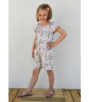 Combinaison fille imprimé feuillages rose et vert Sucre d'Orge modèle Glory. Encolure ronde, ouverture pressionnée milieu devant, la taille marquée par élastique plat. Petites manches couvrant les épaules, 2 poches. Combishort colorée. Composition : jersey 100% coton. Existe du 2 ans au 8 ans.