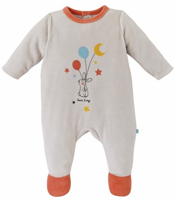 Grenouillère Sucre d'orge réalisée dans un velours rasé gris tendre finitions orangées et animée d'un dessin multicolore plein de tendresse. Pieds élastiqués à l'arrière pour le maintien. Ouverture pont dos pressionné. Composition : 80% coton 20% polyester. Taille du 3 au 24 mois.