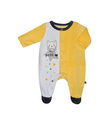 PYJAMA NAISSANCE FERRY Dors bien Ferry velours rasé Sucre d'orge Détails produit : Coloris jaune et blanc - pieds et encolure coloris anthracite. Illustration "Mon petit". Ouverture en Y par boutons-pression. Composition : 75% coton 25% polyester Taille : De la naissance au 12 mois.