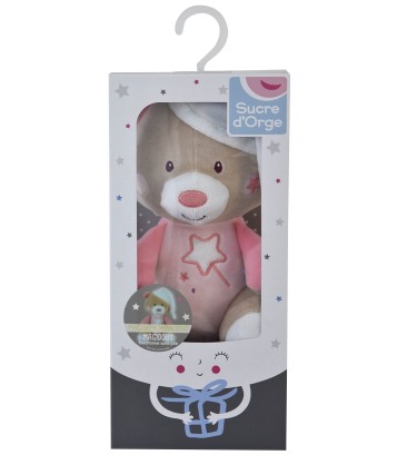 Doudou ours Sucre d'Orge. Ce doudou, en matière phosphorescente illuminera la vie de Bébé. Dès que le soir tombe, il se sentira entouré de tendresse avec ce doudou auquel on ne peut résister. Les doudous Sucre d'Orge sont couverts par le service S.O.S. Doudou®. Composition : velboa 100% polyester - intérieur fibre polyester. Dimension : H 20 cm