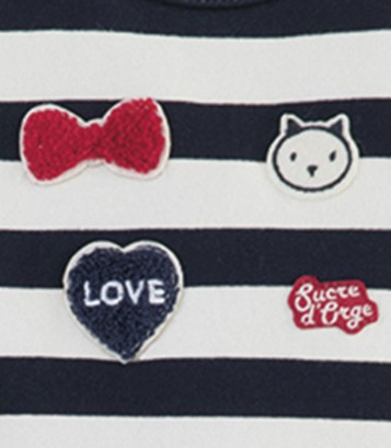 Ensemble bébé fille 3 pièces Sucre d'Orge : T-shirt, short et collants. T-shirt rayé marine/écru en molleton 94% coton, 6% élasthanne animé par différentes appliques sur la poitrine. Fermeture au dos par boutons-pression. Short marine 100% coton avec ceinture élastiquée + 2 poches. Collants rouge/marine en maille 80% coton, 15% polyamide et 5% élasthanne. Existe du 3 au 24 mois.