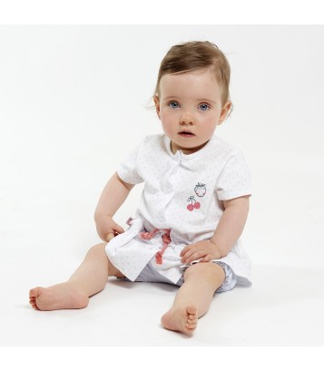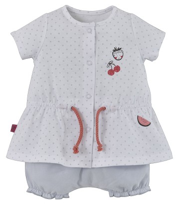 ENSEMBLE ROBE GRIS CLAIR Ensemble robe + bloomer bébé fille Sucre d'Orge. Il se compose d'une roble blanche en jersey imprimé 100% coton. Ouverture devant par boutons-pression. Une culotte en jersey uni 96% coton 4% élasthanne. Existe de la taille 1 mois au 12 mois.