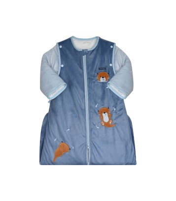 Gigoteuse 6-36 mois à manches amovibles sécu auto modèle Micky Sucre d'Orge . Gigoteuse bébé coloris bleu avec le corps plus foncé et une broderie de loutres sur chaque devant. Ouverture devant à triple curseur qui facilite le passage de la ceinture de sécurité pour les voyages de bébé. Hauteur réglable par bouton-pression au dos. Composition : dessus velours 100% polyester - dessous 100% coton - intérieur ouate 100% polyester. Taille 6/36 mois - longueur 100 cm. TOG 3.50.