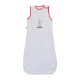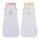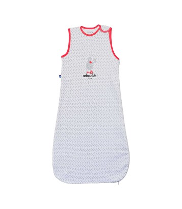 Gigoteuse été Sucre d'orge modèle Cyclamen, existe en 2 coloris. 1 coloris fond blanc avec des empreintes pattes de lapin grises finitions encolure et emmanchures corail le 2ème coloris avec le même imprimé mais les finitions sont jaunes. une tête de lapin et un texte "juste adorable " sont imprimés sur le devant. Zip inversé côté et boutons-pression sur 1 épaule, pour un enfilage facilité. Un rabat avec boutons-pression au dos permet de faire évoluer la gigoteuse suivant la taille de l'enfant.. Composition : Interlock 100% coton. Taille 6/36 mois - longueur : 100 cm. T.O.G 0.50.