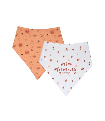 LOT DE 2 BAVOIRS BANDANAS ORELL MAILLE Lot de 2 bavoirs Orell Sucre d'orge. Détails produit : Forme bandana, dessus jersey, dessous éponge. Coloris orange et blanc, imprimé d'animaux ou de maisons . Fermés à l'arrière de la tête par velcro doux. Composition : Dessus 100% coton - Dessous 100% coton. Dimensions : 21 x 40 cm.