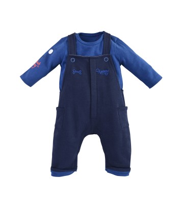 Ensemble salopette et t-shirt bébé garçon Sucre d'Orge. Tee-shirt manches longues uni bleu en jersey 100 % coton. Impression sur l'une des manches. Ouverture par boutons pression sur les épaules. Salopette unie marine en molleton 100% coton. Ouverture devant et entrejambe par boutons pression. Motifs brodés sur la bavette. Bretelles ajustables pressionnées. Ensemble cool et chic à la fois. Existe du 3 mois au 18 mois.