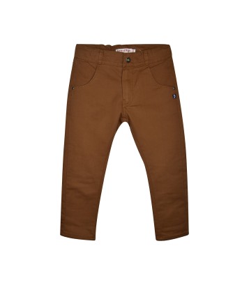 Pantalon Frizon en twill marron Sucre d'Orge tout doublé de jersey du même ton. Monté sur ceinture plate à passants, braguette zippée et pressionnée, 2 poches à l'italienne devant et 2 poches plaquées au dos. Ceinture ajustable par élastique et bouton intérieur. Composition : dessus 98% coton 2% élasthanne et dessous 100% coton. Existe du 3 ans au 10 ans.