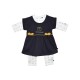 Ensemble robe et combinaison Feroe Sucre d'Orge. Robe manches courtes à revers en molleton anthracite ganse et nœuds jaune à la taille d'où partent des fronces, encolure dégagée arrondie, ouverture pressionnée au dos, motif brodé sur le haut de la robe. Combinaison longue imprimée écru / grise col rond, manches longues, ouverture dos et entrejambe par boutons-pression. Une tenue bien chaude tout confort pour les bébés filles. Composition : Robe 100% coton - combinaison 100% coton. Existe du 1 mois au 12 mois.