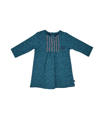 Ensemble robe et legging bébé fille en maille Sucre d'Orge modèle Inza. Robe coloris marine imprimé vertencolure ronde, manches longues, petites fronces milieu devant et dos - pour la fantaisie 3 noeuds et 3 petits volants sont apposés sur l' empiècement devant - ouverture dos pressionnée. Legging rose taille élastiquée, 2 petits noeuds sur chaque bas jambe. Composition : Robe 100% coton Legging 100% coton. Existe du 3 mois au 24 mois.