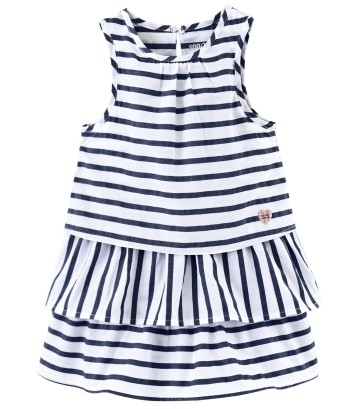 ROBE SANS MANCHES A VOLANTS Robe sans manches Sucre d'Orge en jersey 96% coton 4% élasthanne. Ouverture au dos par goutte boutonnée. Jeux de rayures sur les différents volants. Existe de la taille 2 ans au 8 ans.