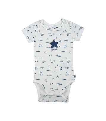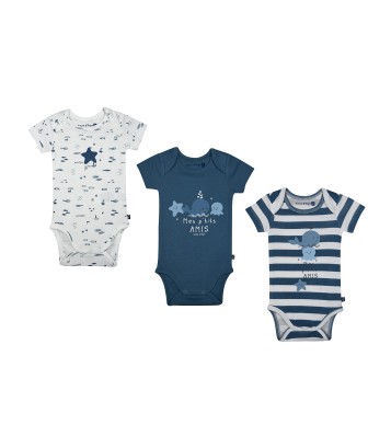 Lot de 3 bodies bébé Lirone Sucre d'Orge manches courtes. Le lot se compose d'1 body blanc/bleu imprimé poissons et bateaux avec illutration étoile, 1 uni bleu avec illustration 3 animaux marins mignons, et 1 body rayé blanc et bleu avec une illustration de 3 animaux marins mignons, tous les deux avec un texte "Mes p'tits amis". Encolure américaine et boutons-pression entrejambe facilitent l'habillage. Composition : Jersey 100% coton. Existe du 3 au 24 mois.