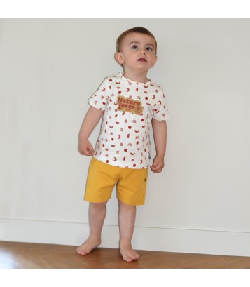 Tee-shirt garçon Lakdar Sucre d'orge T-Shirt blanc manches courtes, à enfiler. Imprimé motifs rouge, un texte sur le devant sur fond marron Nature Lover , avec un petit palmier - Il sera associé à un short pour plus de décontraction ou même un jean pour les journées plus fraiches - Composition : jersey 100% coton. Existe du 2 ans au 8 ans.