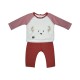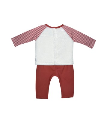 T shirt et pantalon bébé Sucre d'Orge. T Shirt bi-matière - manches longues jersey imprimé rayé écru / brique, corps velboa écru, ouverture dos par boutons-pression. Illustration brodée devant. Pantalon coloris brique monté sur taille élastique - 2 poches plaquées devant. Un ensemble tout confort pour les bébés garçons !. Composition : T shirt manches jersey 100% coton corps velboa 100% polyester, pantalon molleton 96% coton 4% élasthanne. Existe du 3 mois au 24 mois.