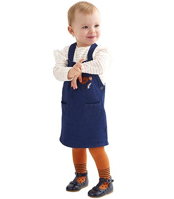 ROBE EN JEAN ET T-SHIRT BONNIE T shirt et robe salopette Sucre d'Orge Détails produit : Robe salopette en jean, ouverte jusqu'à la taille par gros boutons-pression, bretelles réglables, 2 petites poches. T shirt manches longues avec volants aux épaules rayé écru/caramel brillant, ouverture totale dos par boutons-pression. Composition : Robe 98% coton 2% élasthanne T-shirt 100% coton. Tailles : du 3 au 24 mois