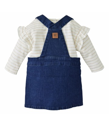 T-shirt + robe-salopette BONNIE pour les bébés Sucre d'Orge ! Robe en jean 98% coton 2% élasthanne à bretelles réglables par pressions - ouverture par boutons-pression jusqu'à la taille - 2 petites poches - Broderies. T-shirt manches longues rayé écru/ caramel brillant 100% coton - ouverture totale dos par boutons-pression - volants aux épaules. Existe du 3 au 24 mois.