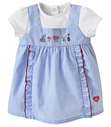 Ensemble bébé fille 2 pièces Sucre d'Orge du thème POMME D'AMOUR. Robe à bretelles blanc / bleu à très fines rayures verticales qui se la joue rétro avec ses petites broderies sur le haut, et ses volants ce chaque côtés surlignés de rouge, ouverture dos par boutons-pression. Elle est accompagnée d'un t-shirt blanc à encolure ronde et ouvert au dos par boutons-pressions. Composition : Robe en tissé teint 100% coton - tee-shirt 100% coton. Existe du 1 mois au 24 mois.