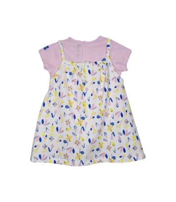 Sucre d'orge présente cette Ensemble robe modèle Groseille confectionnée dd'une robe en jersey blanc imprimé de jaune/rose et bleu, finition ton sur ton pour encolure et bretelles. Ouverture mi-dos par boutons-pression. Ttshirt en jersey rose manches courtes avec ouverture dos par pressions.Un petit ensemble robe d'été facile à vivre ! Composition : Jersey 100% coton. Existe du 3 au 24 mois.