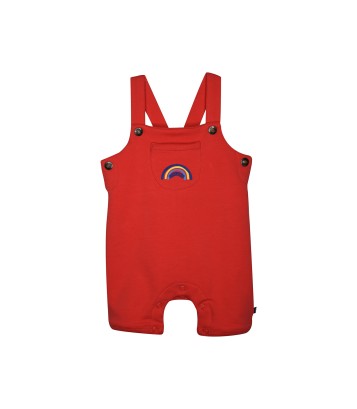 Tee-shirt et salopette Leonard en maille Sucre d'Orge. Petit ensemble d'été tout doux pour la peau de bébé ! T-shirt blanc uni, encolure ronde, manches courtes avec ouverture au dos par boutons-pression. Salopette rouge, ouverture bretelles et entrejambe par boutons-pression, bretelles réglables, petite poche au niveau de la poitrine avec motifs arc en ciel. La poche lui apporte un petit air décontracté et une belle finition. Composition : T-shirt : 100% coton, salopette 100% coton et bord-côtes 97% coton 3% élasthanne. Existe du 3 au 18 mois.