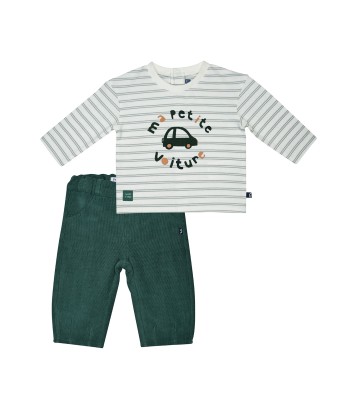 Ensemble t-shirt pantalon bébé garçon Sucre d'Orge modèle Milan. T-shirt écru avec des rayures grises, manches longues, col rond, illustration voiture "Ma petite voiture" - ouverture dos pressionnée. Pantalon vert, taille élastique, fausse braguette ornée d'un petit bouton, 2 petites poches. Tout pour une tenue parfaite ! Composition : t-shirt 100% coton, pantalon 100% coton. Existe du 3 mois au 24 mois.