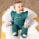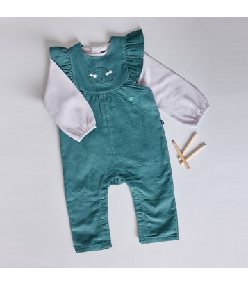 T shirt et salopette velours côtelé bébé fille Sucre d'orge modèle Manon. T-shirt bleu ciel à manches longues encolure ronde / ouverture dos pressionnée. Salopette en velours vert, bretelles volantes, ouverte milieu dos par pressions et une broderie sur le devant - ouverture à l'entrejambe par boutons-pression. Un ensemble chic et confortable, il fera le bonheur des petites filles ! Composition : T-shirt 100% coton, salopette dessus 100% coton dessous 100% coton. Existe du 1 mois au 12 mois.