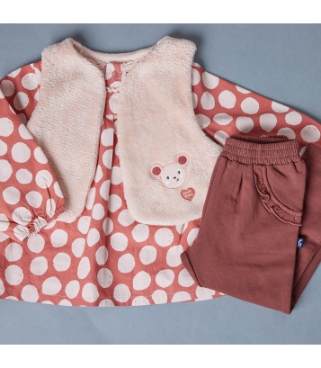 Ensemble 3 pièces bébé fille Sucre d'Orge modèle Mia. Tunique rose foncé à pois rose clair, manches longues, froncée à l'empiècement, pressionnée au dos et fantaisie sur le col. Jegging bordeaux, taille plate élastique, détails aux niveau des poches. Gilet sans manches, peluche et doublure rose très clair - une petite souris brodée vient illustrer la tenue. Composition : Tunique 100% coton, jegging 96% coton 4% élasthanne Gilet dessus 100% polyester dessous 100% coton. Existe du 3 mois au 24 mois.