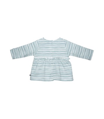 Tunique et legging bébé fille modèle Fouenant Sucre d'Orge. Ensemble maille tout souple pour le confort de bébé. Tunique bicolore écru rayé gris bleuté, manches longues et col rond, ouverture dos pressionnée, broderie poitrine, empiècement jupe rapporté et froncé. Legging jaune assorti à la broderie. Composition : Tunique 100% coton et legging 100% coton. Taille du 3 mois au 24 mois.