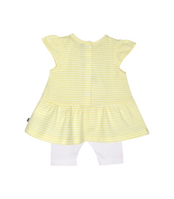 TUNIQUE LEGGING GRANNY BEBE "Tunique et legging Granny en jersey marque Sucre d'Orge Détails produit : Tunique manches courtes coloris blanc rayé de jaune. Motif fleur+animaux sur le devant. Ouverture mi-dos pressionnée. Legging court blanc. Composition : Tunique et legging jersey 100% coton. Tailles : Du 3 mois au 24 mois."